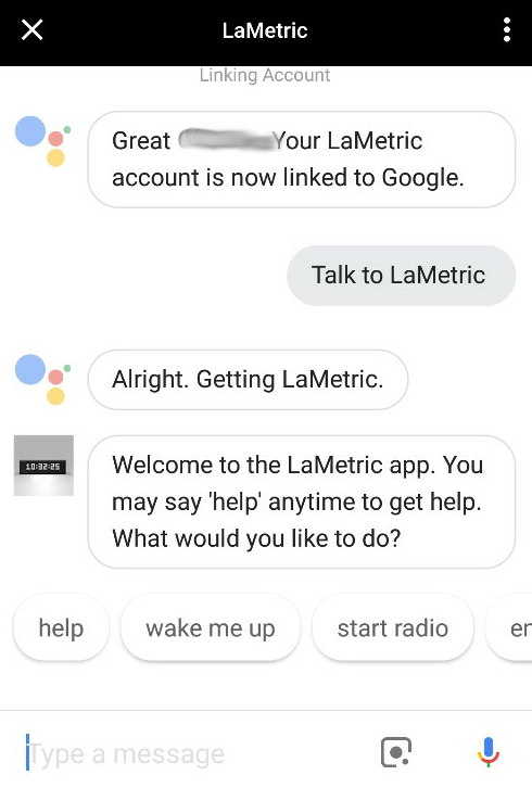 After that, your LaMetric account will be linked to Google Assistant and you will be able to control LaMetric from Google Assistant. You can enter the LaMetric Time app by saying 'Talk to LaMetric' and explore it: